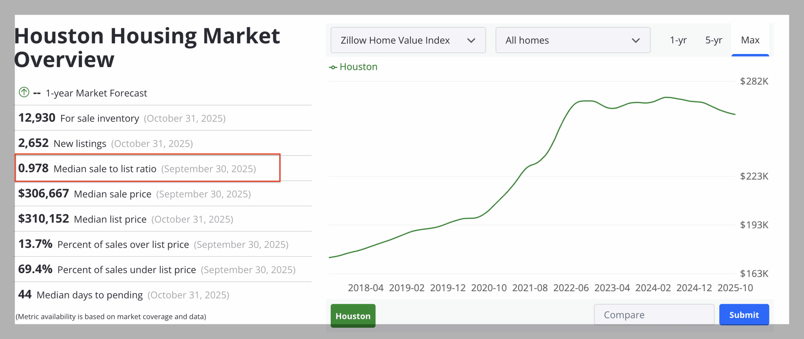For example, you can Google a phrase like “sale-to-list ratio Houston TX,” and the results will include a list of websites like Zillow and Realtor.com that regularly monitor sale-to-list ratios in most markets throughout the country. Below is an example of how this data might look on Zillow’s Market Overview page.