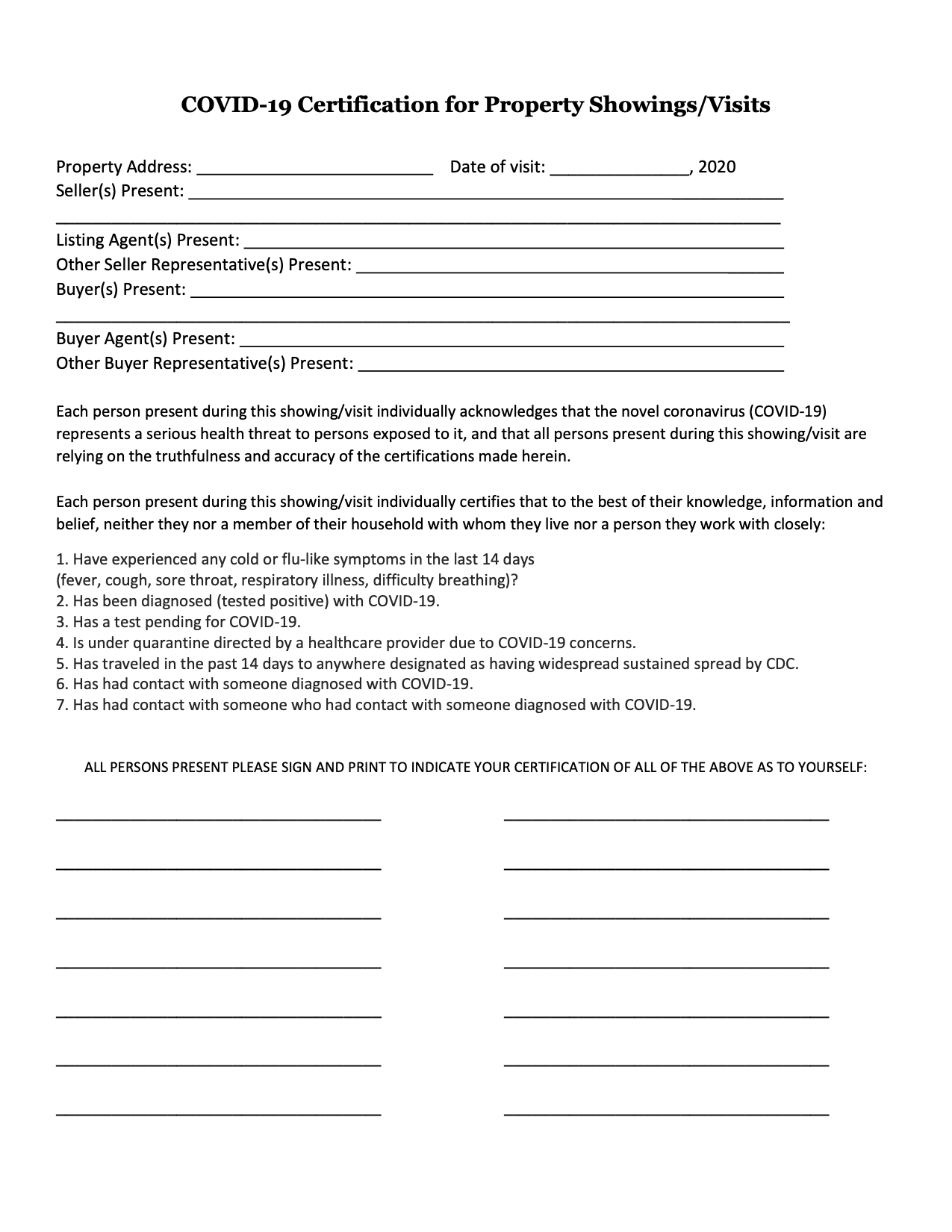 The document is signed by all parties present at a showing — this includes any agents, sellers, as well as the potential buyers — representing that, to the best of their knowledge, they are not infected with and have not been exposed to the coronavirus.