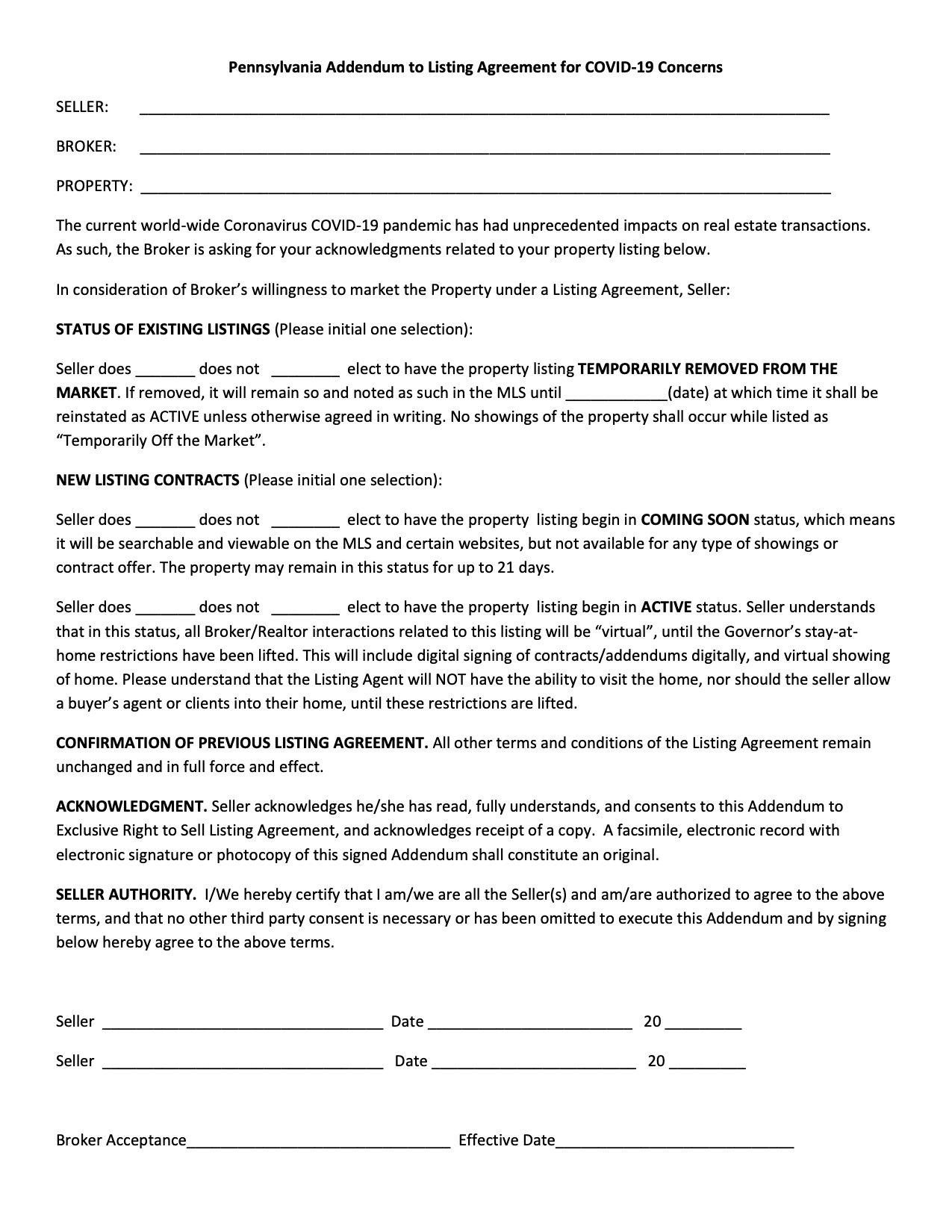 Given the concerns with timing, Pennsylvania now even has a coronavirus addendum for listing agreements. The clause asks existing sellers to elect (or not) to temporarily remove their property from the market and new sellers to choose whether their listing should begin in “coming soon” or “active” status.