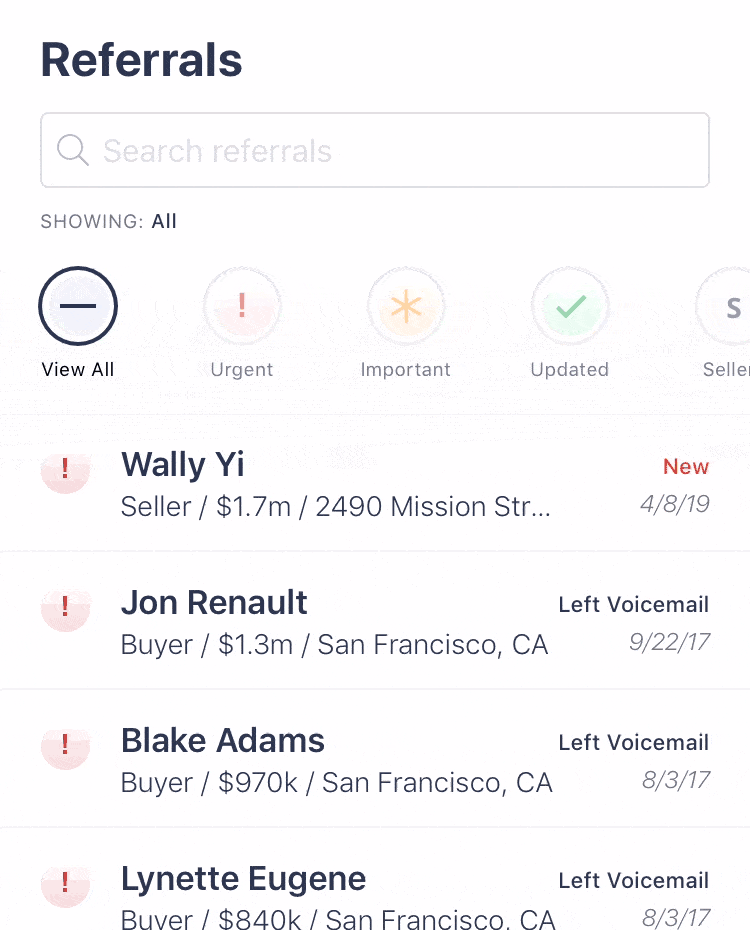 Need to find a referral but forgot their name? No sweat! With our expanded filtering functionality, you can filter for referrals by their stage (listed, escrow, closed) or type (buyer or seller) in the “Referrals” tab. You can search for their name or address and even revisit inactive leads. This new system allows you to view all of your referrals without endlessly scrolling and second-guessing.