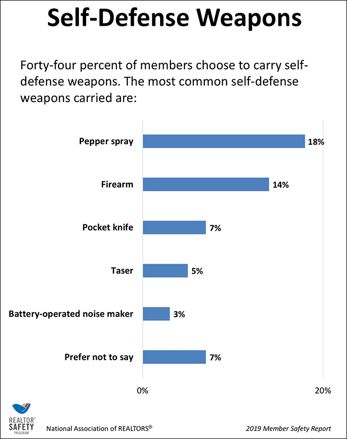 As you can see above, firearms are also a popular form of self defense. Hawkins says she believes that more agents are carrying firearms than ever, and the NAR report shows that 14% of agents carry a gun on the job.