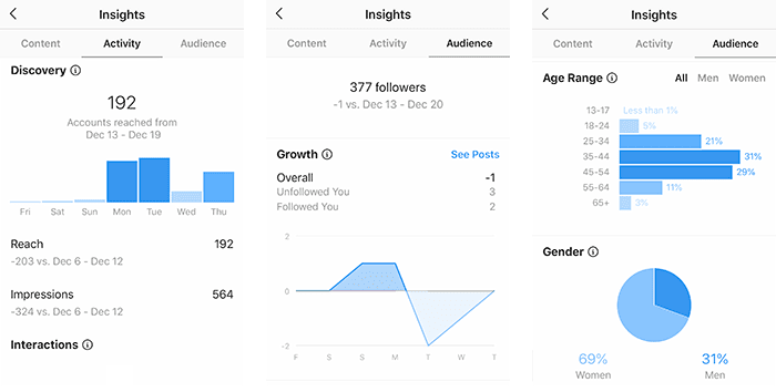 Once your Business account is set up, go back to your main account screen and click those three horizontal lines in the top right-hand corner again. Then look for “Insights” and click that. You’ll see data related to your content, activity, and audience. You can also see data for specific, individual posts by tapping a post and clicking “View Insights.” Viewing stats for individual posts is helpful because it can show you how many people responded to your post, saved it, and visited your profile after seeing it.