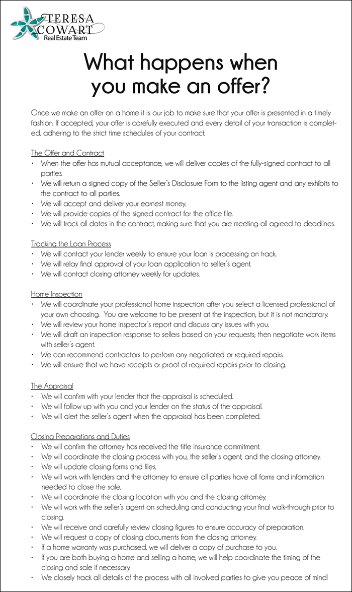 Cowart’s buyer booklet gives her clients a detailed look at the step-by-step home-buying process, advice for buyers before they begin looking at homes, and a detailed guide to what happens when they write an offer.