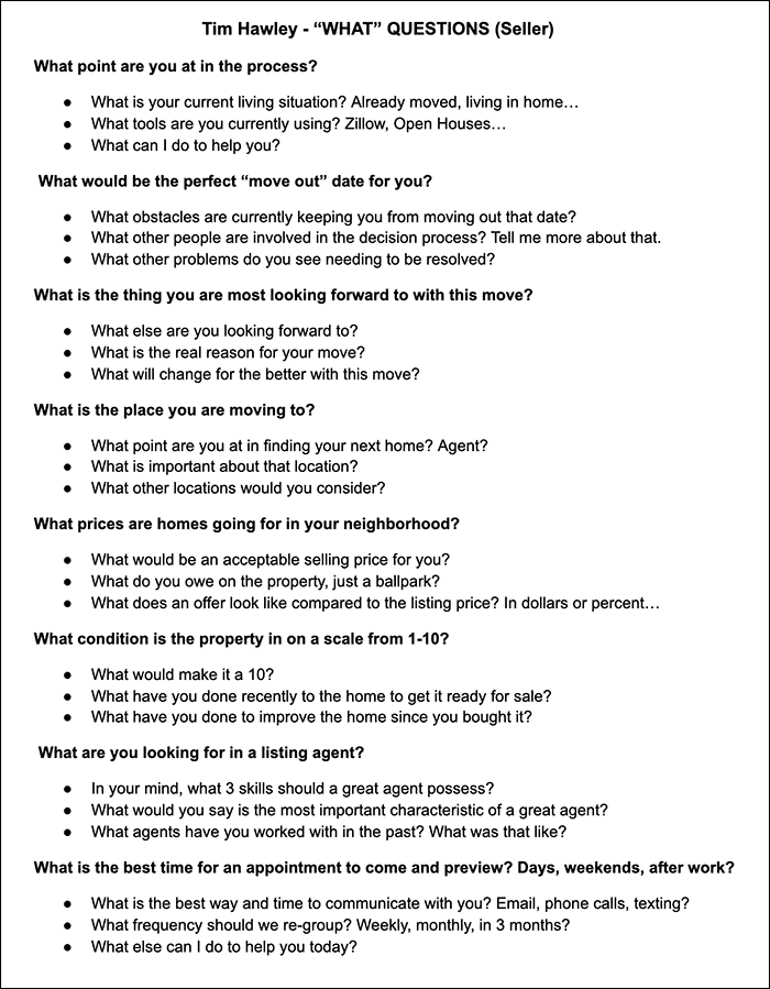 From his list of questions for potential seller clients, Hawley explains his “three deep” concept, which involves asking one main question, with three similar questions to follow.
