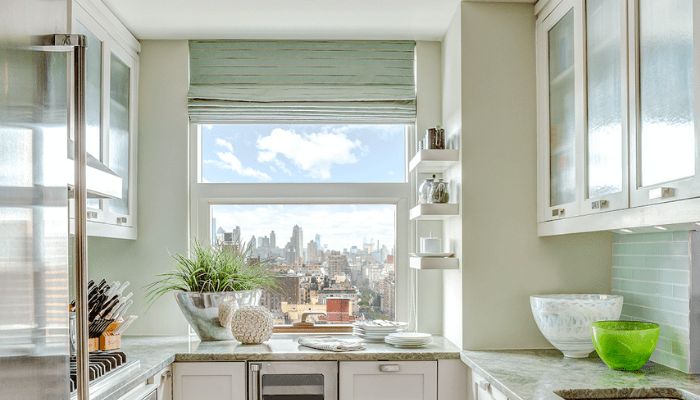 In this Manhattan kitchen, Chrisicos used a simple valance that tied in with the neutral color scheme and helped soften the space without impeding the city views: