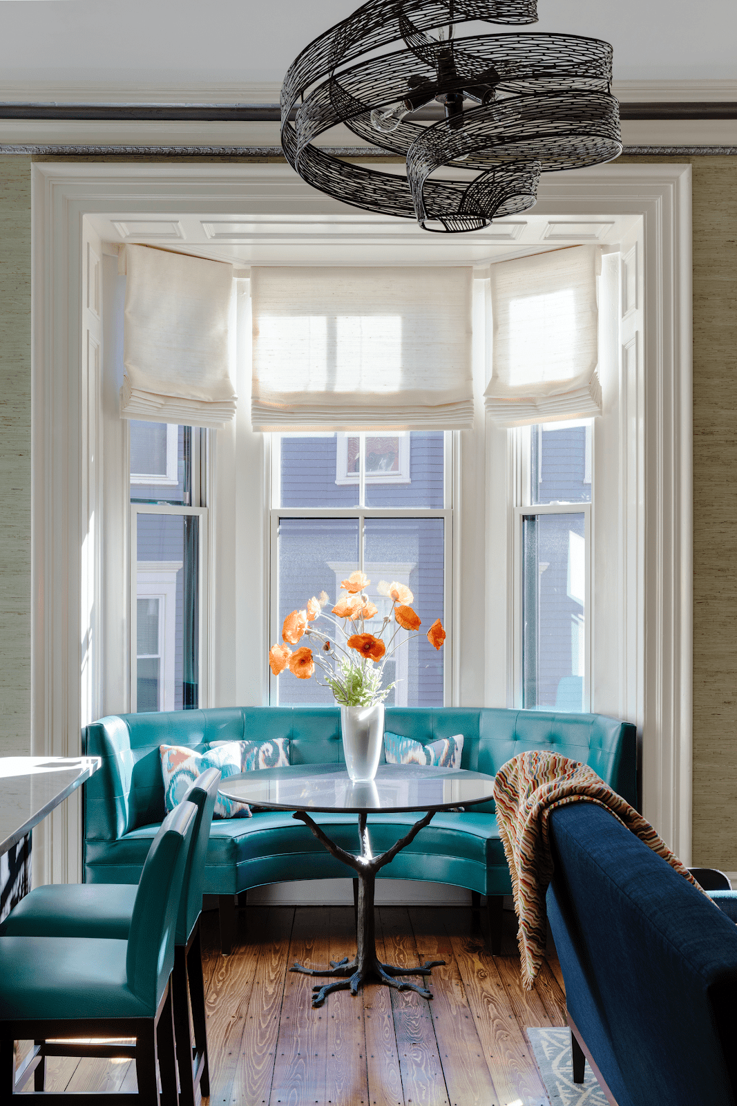 Chrisicos used soft, Roman-style valances in a creamy, neutral shade to soften this seating area without blocking the natural light: