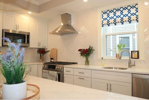 Jess Harrington, owner of Boston-based staging and design firm JessFinessed, says valances were a peak treatment option in the ’90s, especially jewel tones, pastels and country-style prints. These days, most of her clients prefer bare windows if light filtering and privacy aren’t a concern. However, sometimes she’ll incorporate valances. This sleek patterned valance adds a modern touch and splash of color to an otherwise monochromatic kitchen: