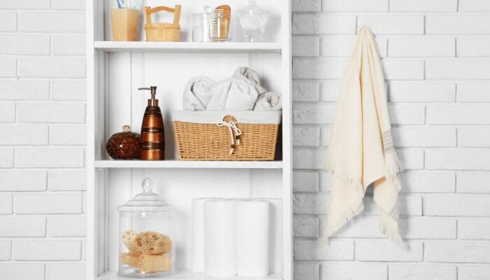 Keep your current toilet paper roll where it is (if it’s on a holder), and if you have extras, put them away unless you’ve got a purposeful way to display them, such as in the shelving below: