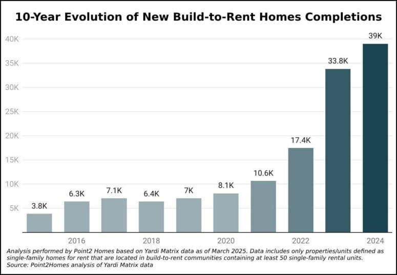 At the state level, Texas, Florida, and Arizona are leading the charge in total build-to-rent homes built. The South, in general, is seeing the strongest momentum, but growth is expanding into new regions. Places like Georgia, the Carolinas, and even California are now offering more BTR options.