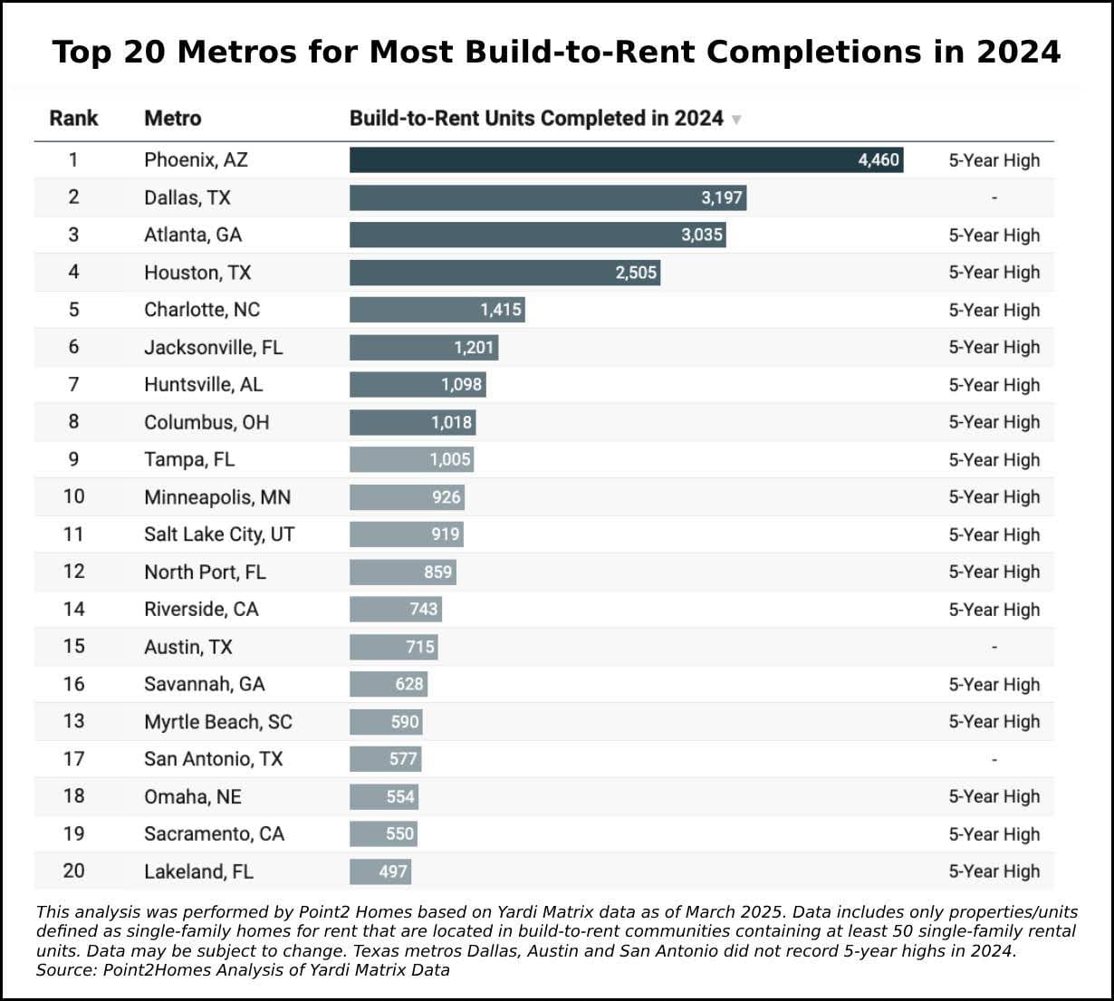 - Phoenix, Arizona saw the most BTR completions in 2024, with 4,460 new single-family rental homes — an 18% increase from the previous year.