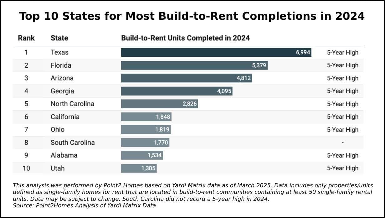 At the state level, Texas, Florida, and Arizona are leading the charge in total build-to-rent homes built. The South, in general, is seeing the strongest momentum, but growth is expanding into new regions. Places like Georgia, the Carolinas, and even California are now offering more BTR options.