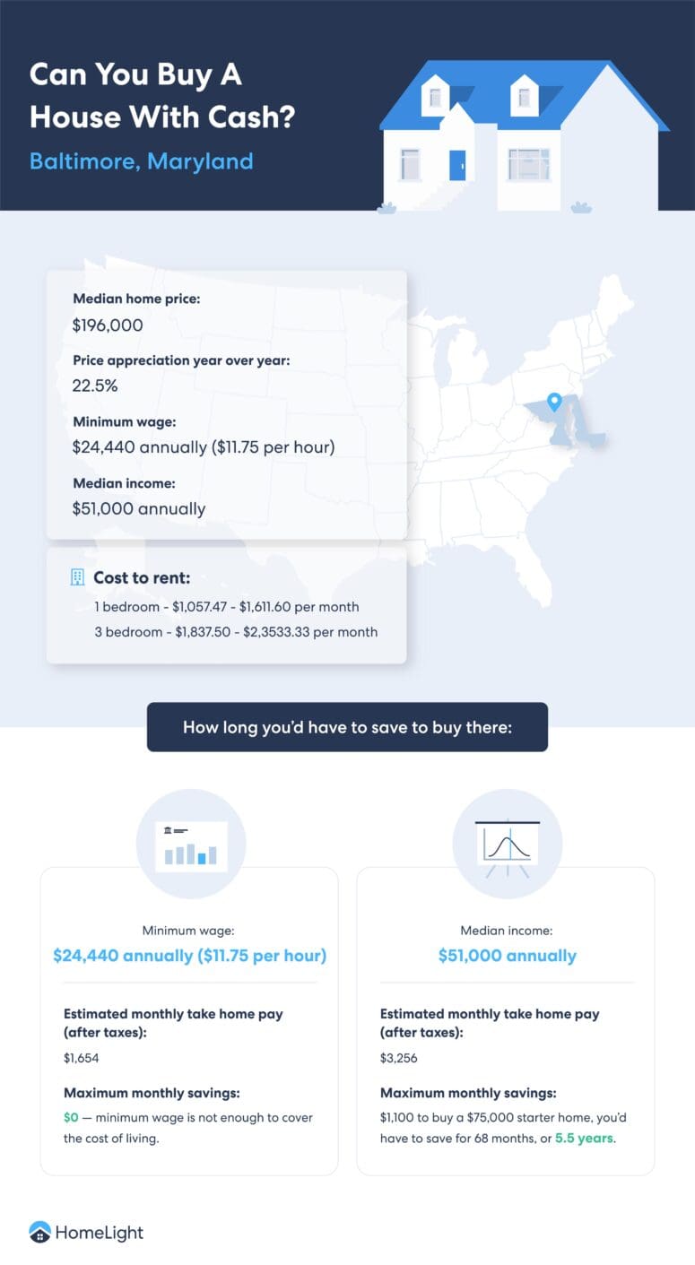 Unfortunately, with a cost of living at $1,577 per month — not including healthcare costs or monthly debts — Baltimore’s minimum wage wouldn’t leave you any breathing room to save for a home in cash.