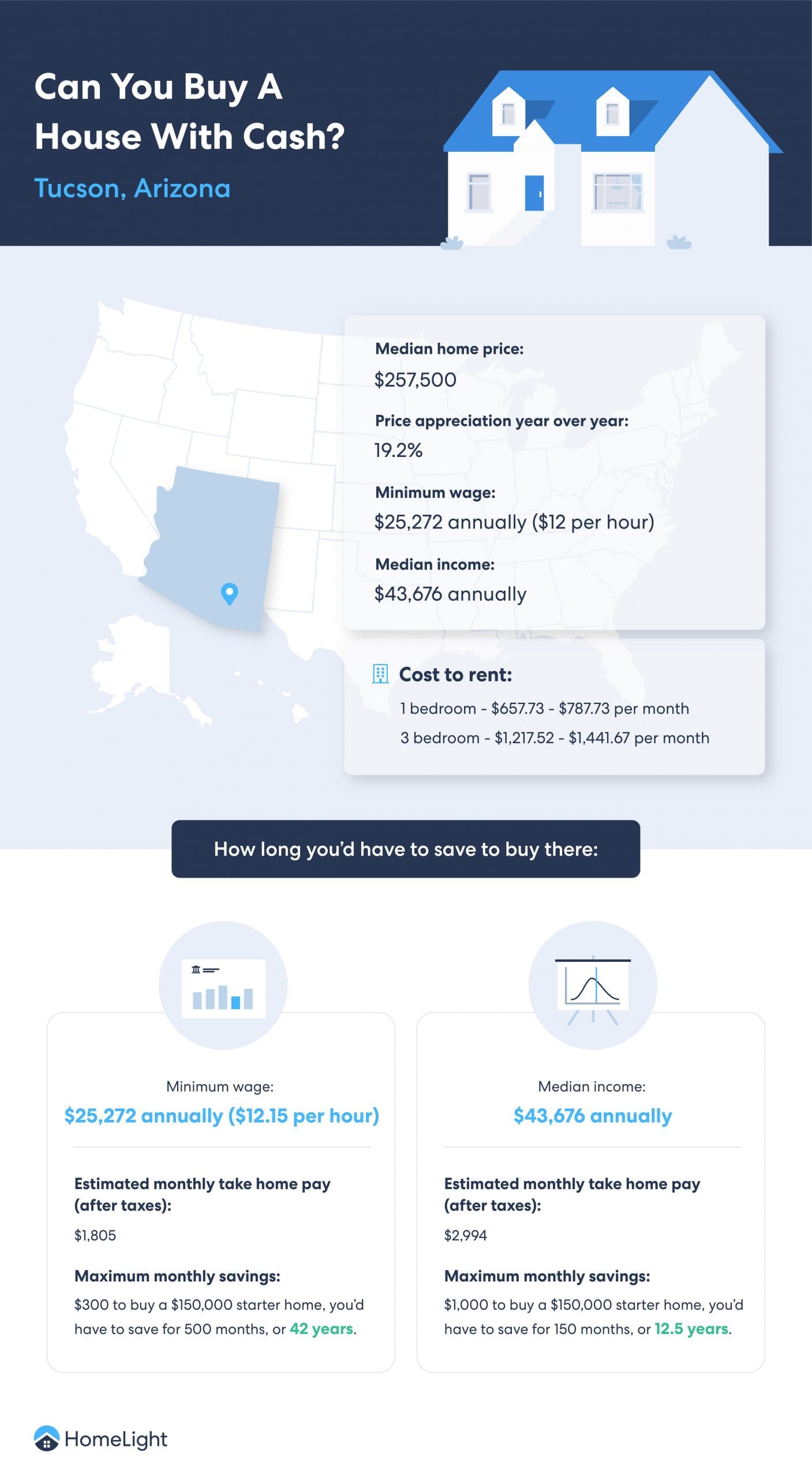 Assuming you could save $300 per month, and you were buying a starter home for around $150,000, it would take you 500 months, or nearly 42 years to buy a home in cash on minimum wage in Tucson.