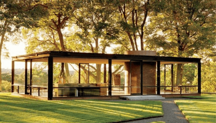 Johnson built The Glass House in New Canaan, Connecticut, in the International Style as a glass box that drinks in the landscape. The home resides on a hill in the woods with no interior walls and is entirely transparent. Mies designed most of the home’s furnishings. Johnson lived in his iconic house from 1949 until he died in 2005.
