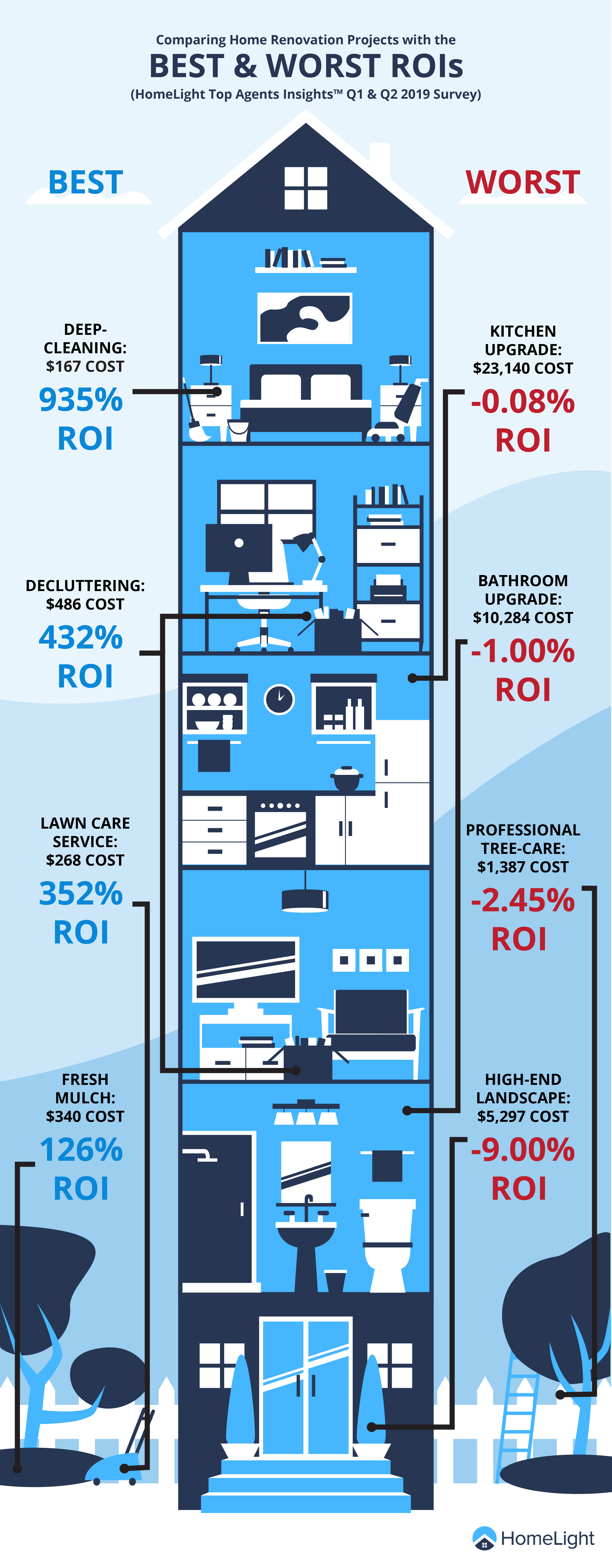 So, it’s smarter to do these low-ROI upgrades when you first buy your house while you’ve got years of homeownership ahead of you. That way you’ll get some mileage out of your upgrade investment as a trade-off for the lack of a return you’ll get in real world dollars.