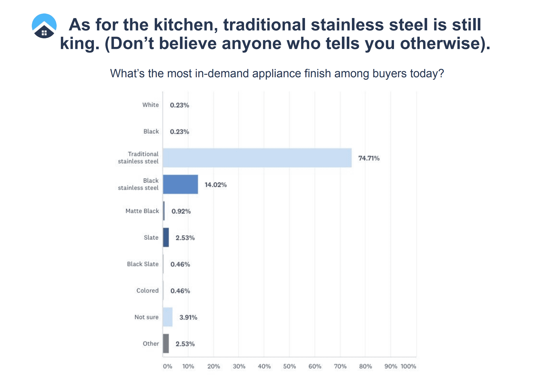 Steer clear of any appliance finish fads, like slate or black stainless steel. Almost 75% of buyers prefer traditional stainless steel over other finishes.