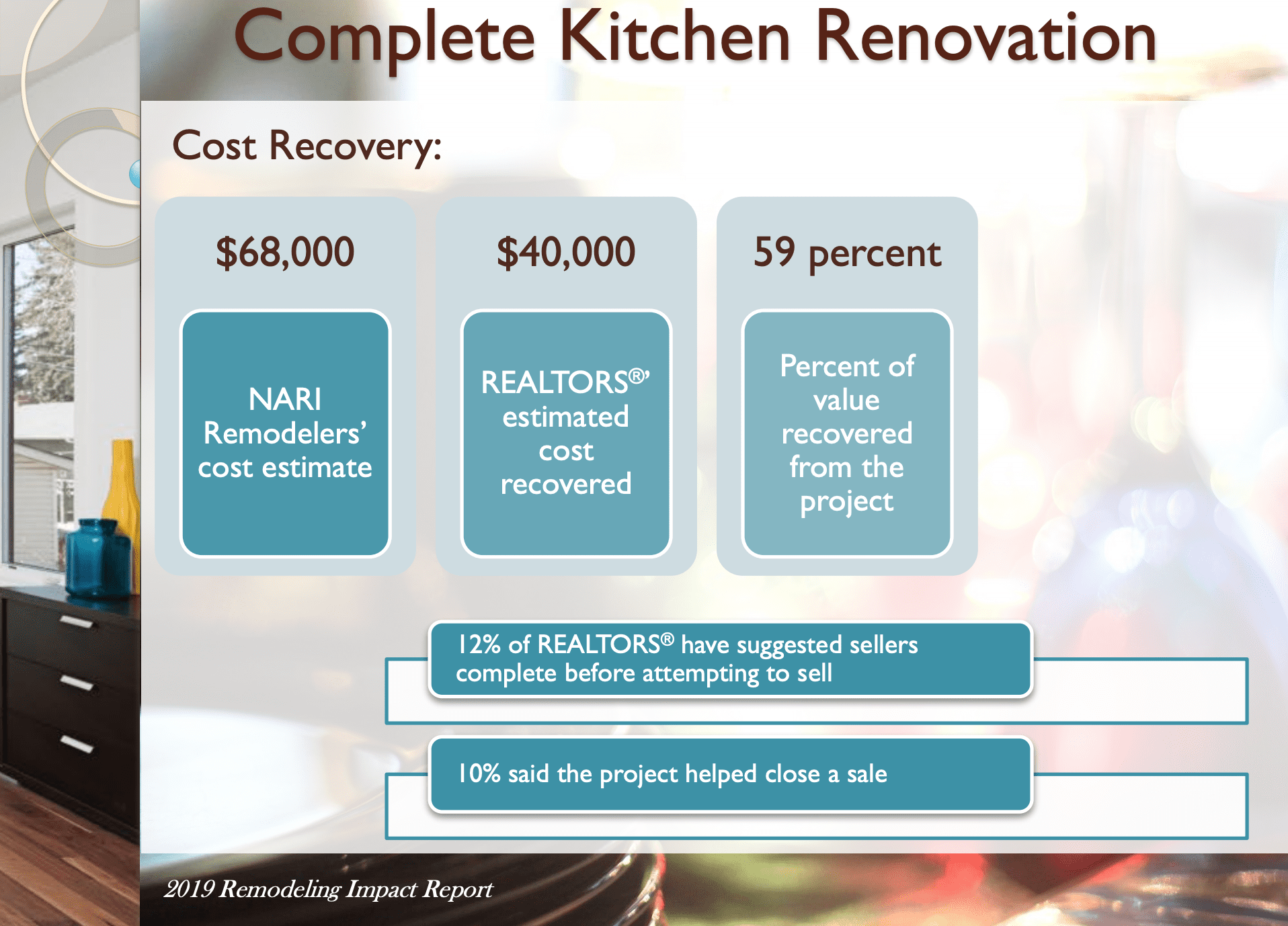 Kitchen upgrades top the list with a joy score of 10 out of 10 according to the National Association of Realtors’ (NAR) 2019 Remodeling Impact Report. While the value recouped on a complete kitchen renovation is only around 59%, new owner customization comes in at number two on the top reasons for the upgrade.