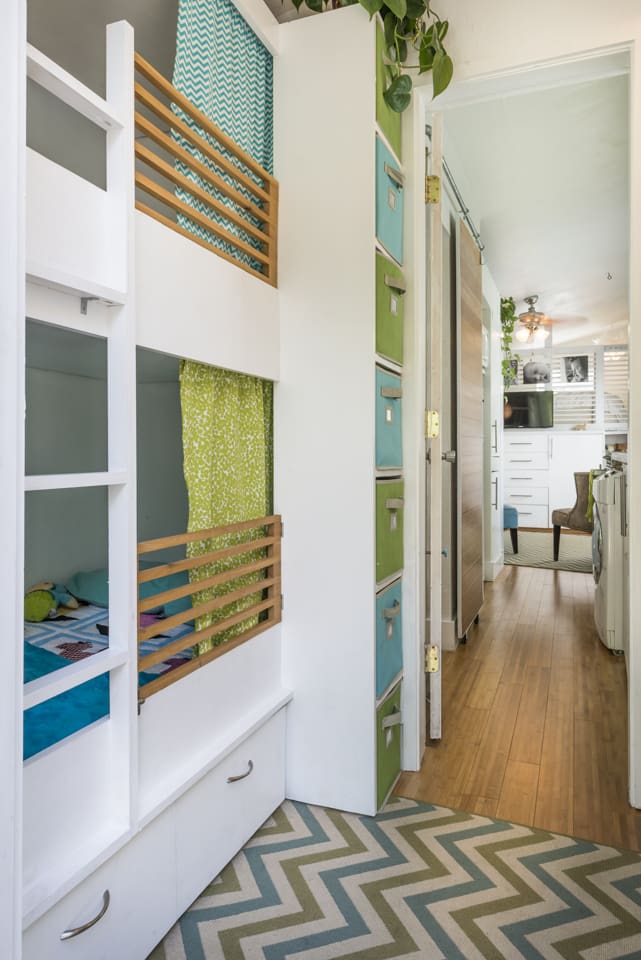 At the rear of the house, what was originally a patio is now the bedroom for Miller’s two children, ages 7 and 5. When her second child was born, Miller enclosed the patio to create a bedroom with a bunk bed-like arrangement, increasing the size of the house by 36 square feet.