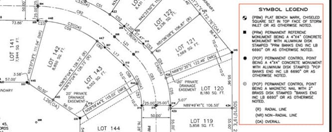 Keep in mind, all the plots — or each separate property unit — are represented by the individual square- or rectangle-shaped boxes on the map. Symbols and drawings will vary from one plat map to another, so always reference the legend.