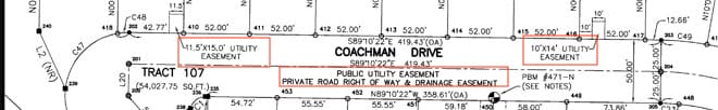 Easements will be labeled along roads for access easements, within individual plots for drainage and utility easements, and anywhere else on the plat map indicated by the word “easement” and the corresponding type. Some easements, like sewer and utilities, will include the dimensions of the exact size.