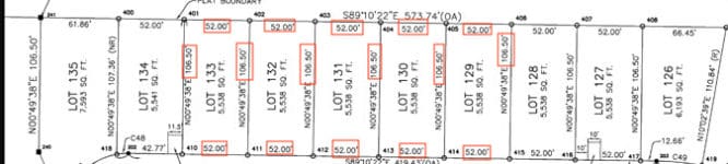 The plot dimensions can be calculated by looking at the numbers listed with a decimal or with the symbol for feet next to the number. These measurements appear around the plot’s edges, inside of the box. If multiple plots have the same dimensions, the number may be listed only once, meaning it’s consistent with the other plots.