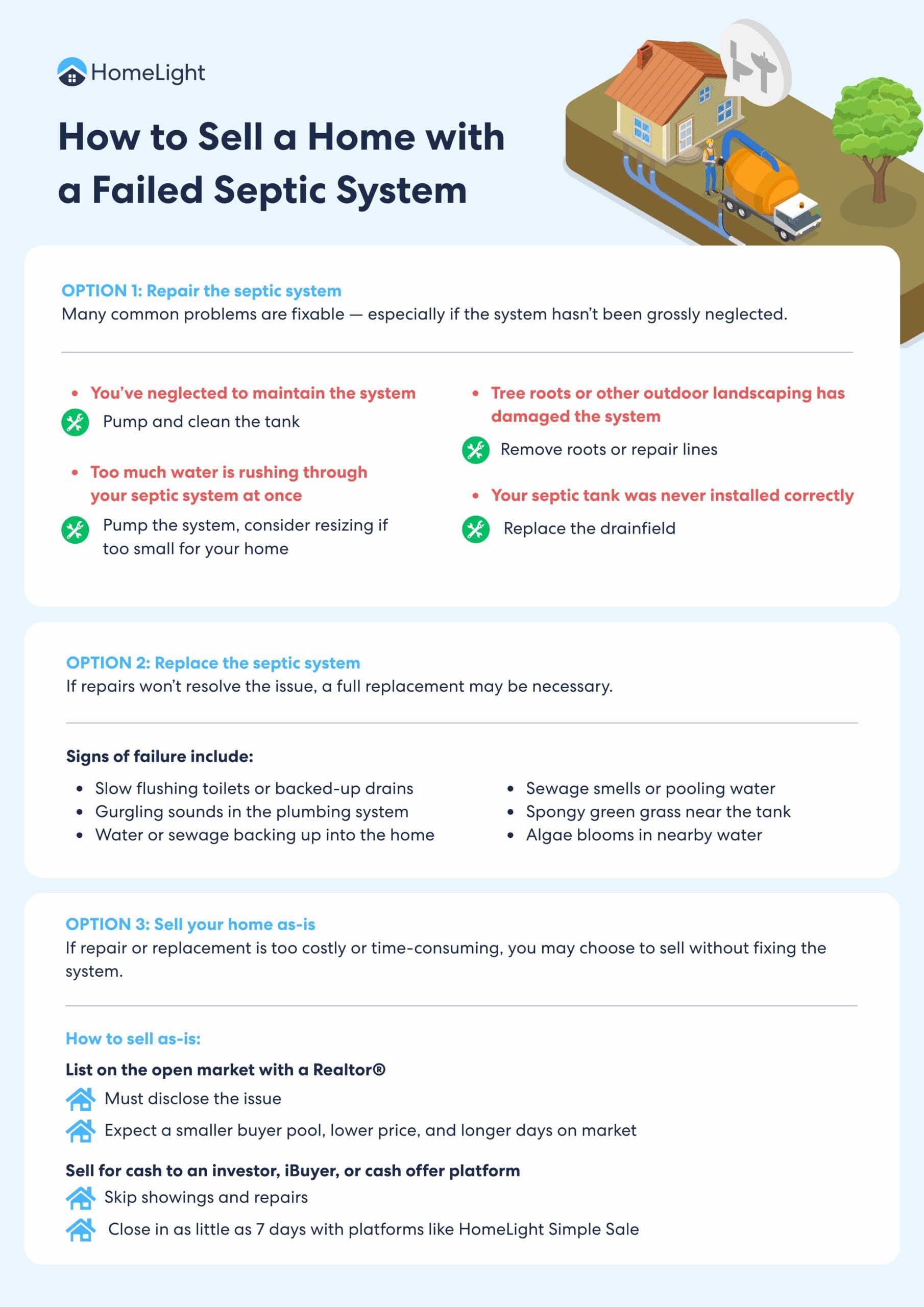 In some markets, offering a discount might not be enough. You don’t have to fix the system yourself, but be prepared to cover the cost of the replacement of the septic tank as an allowance against the sales price of the home.