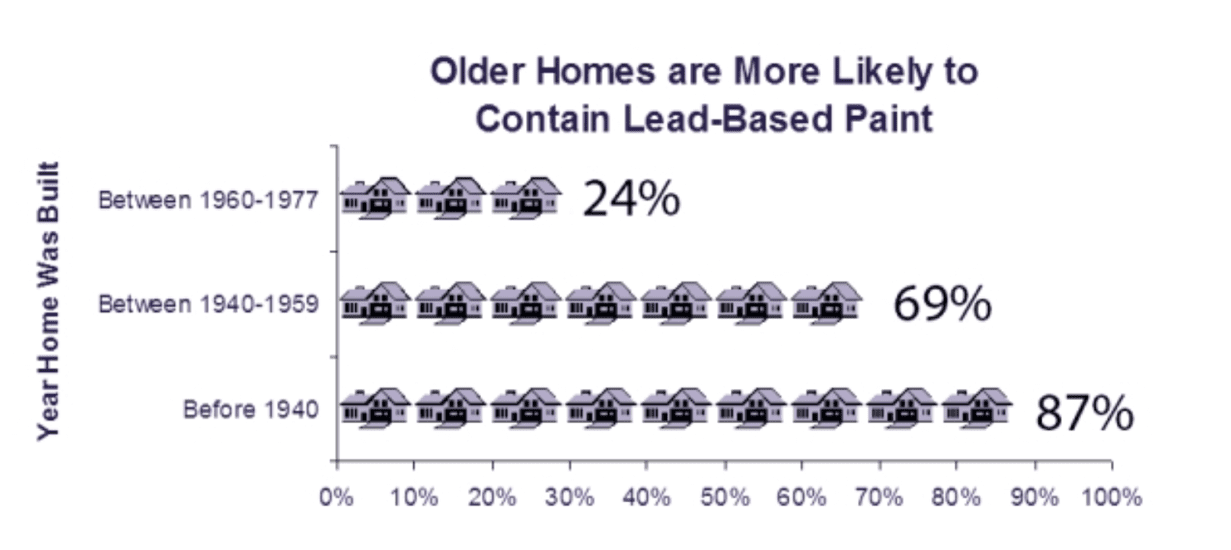 However, by the 1960s, the use of lead paint in residential homes had already fallen off dramatically — to only 24% — compared to 69% of newly built homes that contained lead-based paint in the ‘40s and ‘50s.