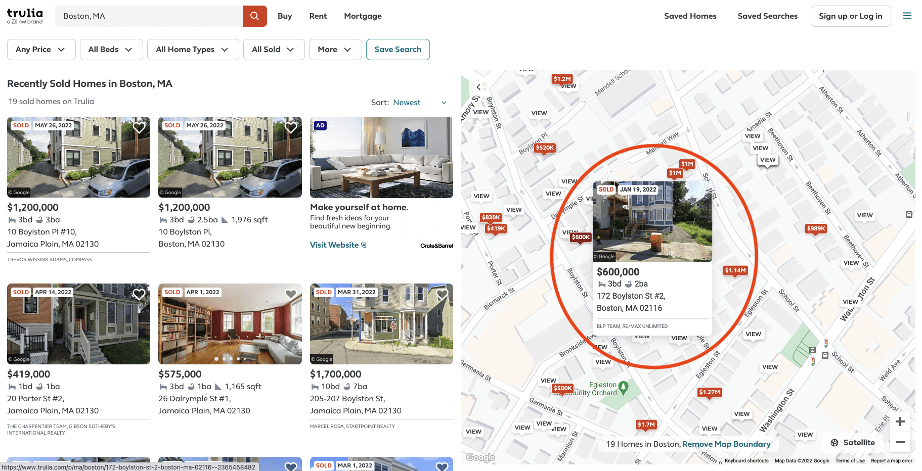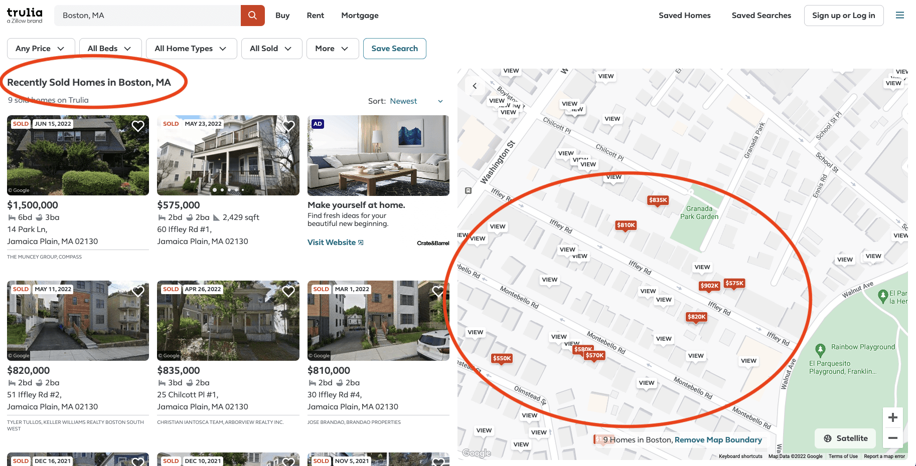 Like Zillow, you’ll see the newest recently sold home listings with each property plotted on an interactive map. You can zoom in on your neighborhood and see sold properties near your home.