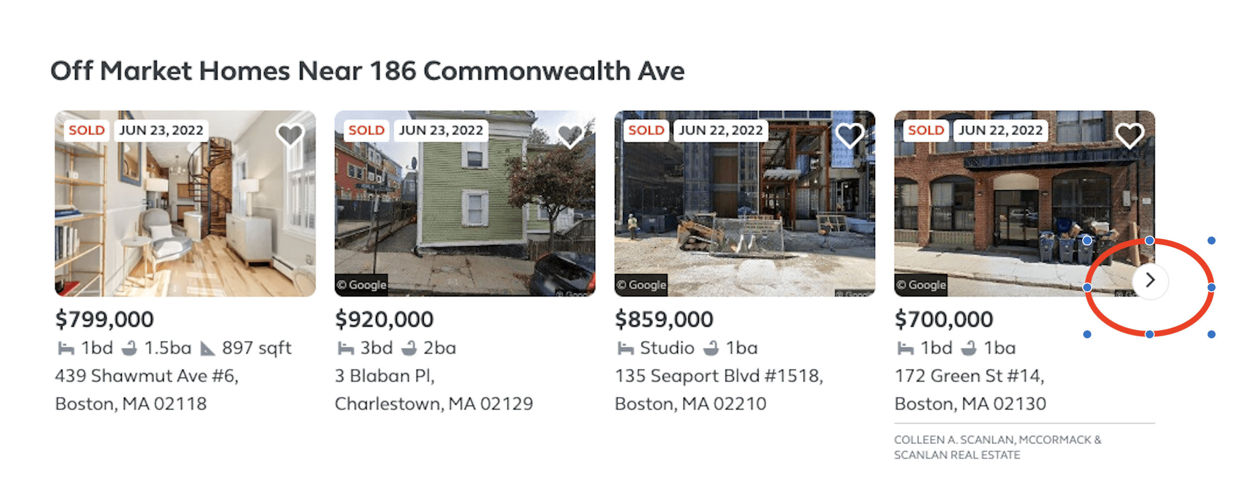 For some listings, if you scroll down on the detail page you will see an image carousel showing off-market homes sold near the property you selected. Click through the carousel to view more sold homes.