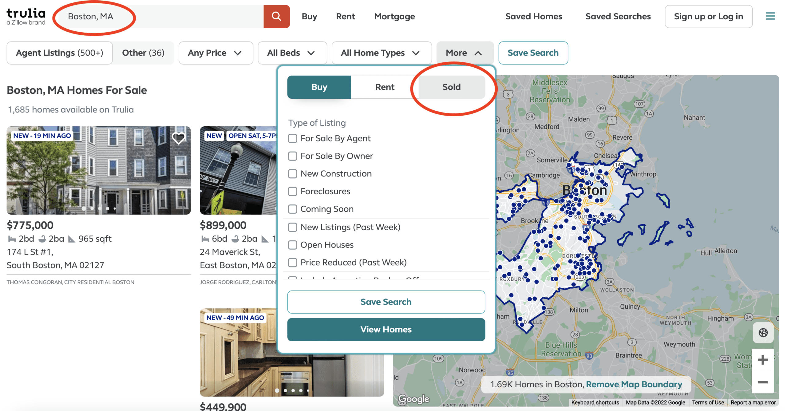 Pro tip 2: For a fast jump, select your state or major city from this Trulia site map page, then enter your city name or ZIP code in the search bar. Now, simply select “Sold” under the more menu.