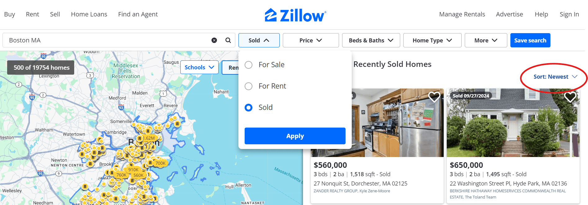 At the top of the screen, under “For sale,” filter for “Sold” so you’re only seeing the yellow dots. On the upper-right, be certain you are sorting by “Newest” listings so you are looking at the most recently sold properties.