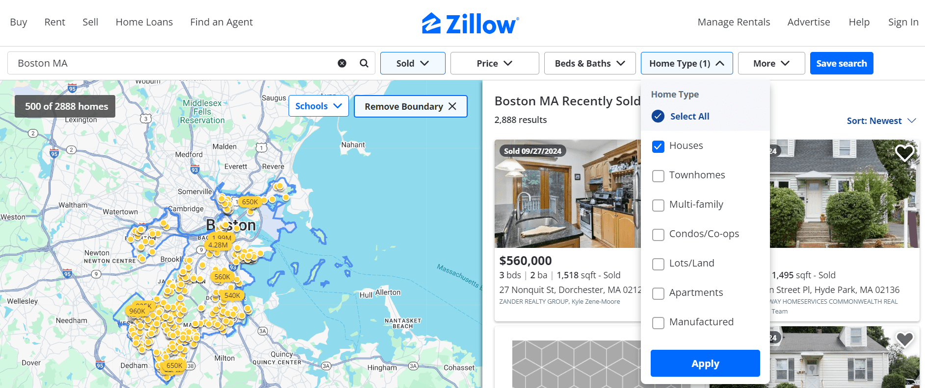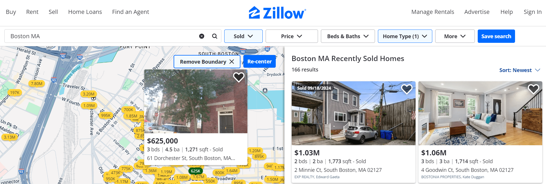 Start your search for comps on Zillow by typing your city and state into the search bar. Or, you can type in a zip code. If you live in a large city, like Boston, you can also search by neighborhood.