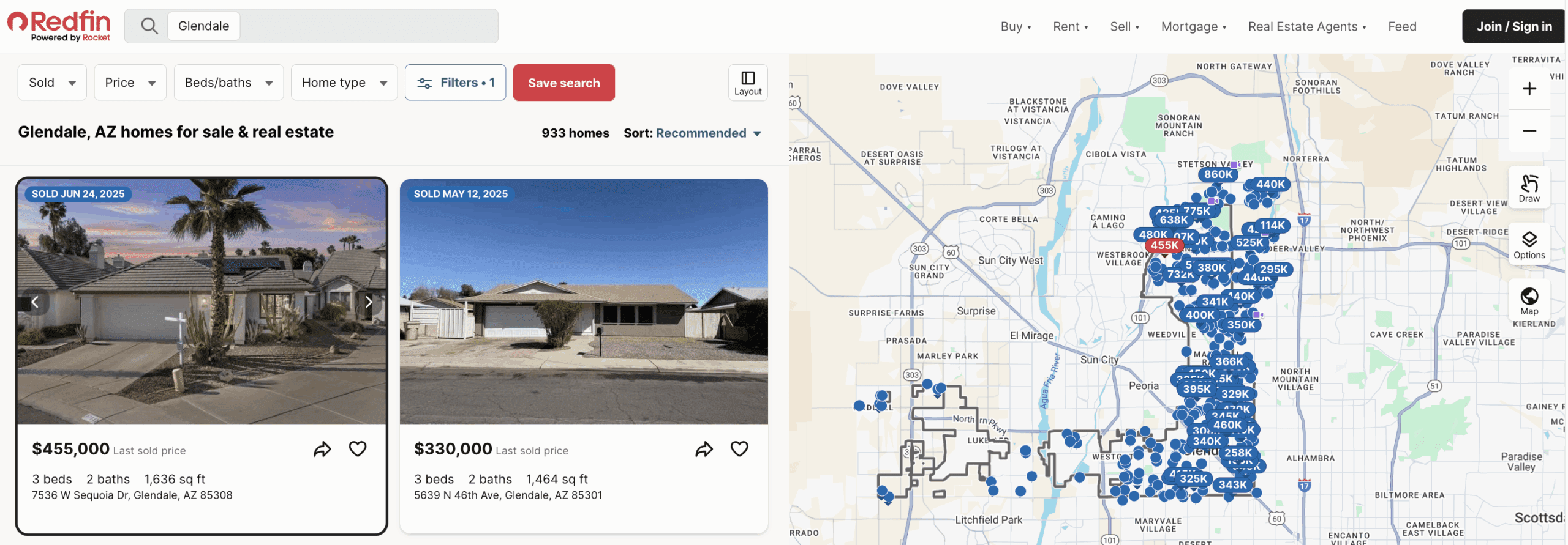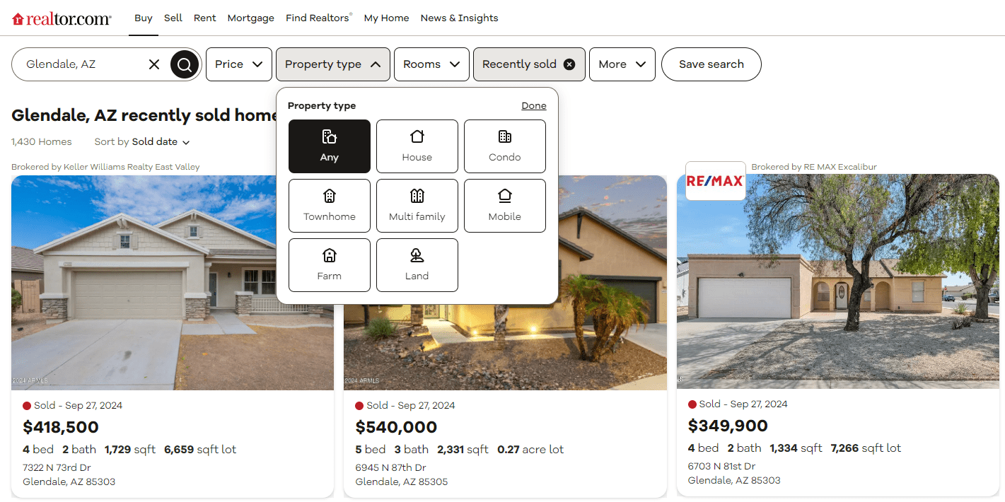 Pro tip: Assembling comps through Realtor requires a bit more legwork, as you can’t zoom in on a map or by ZIP code/neighborhood to narrow down the “Just Sold” listing pool in your city. As you can see in the screenshot below, a search for “Just Solds” in Glendale, AZ, serves up 1,430 results alone. But under the “More Filters” option, you can also filter by: