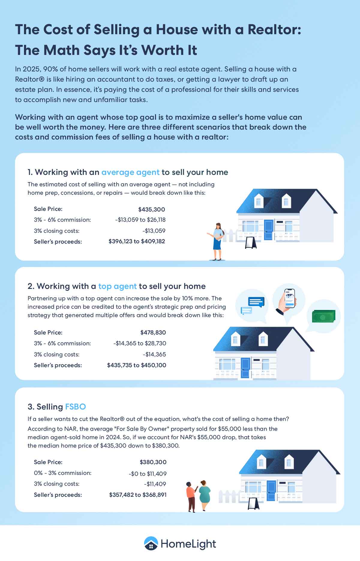 Of the avenues above, the one where you walk away with the most money is the scenario where you work with a top agent. In this example, you take home over $42,000 more than if you worked with an average agent, and over $97,000 more than if you sell your home yourself.