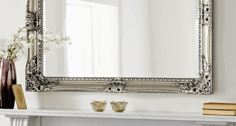 To get the look, go for distressed wood frames and large framed panels of antiqued mercury glass tiles.