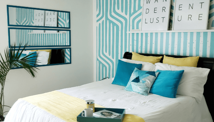 Montgomery suggests doubling or tripling up on mirrors on a bedroom wall by stacking rectangular mirrors horizontally as a modern alternative to wall art, which risks overpowering a small space.