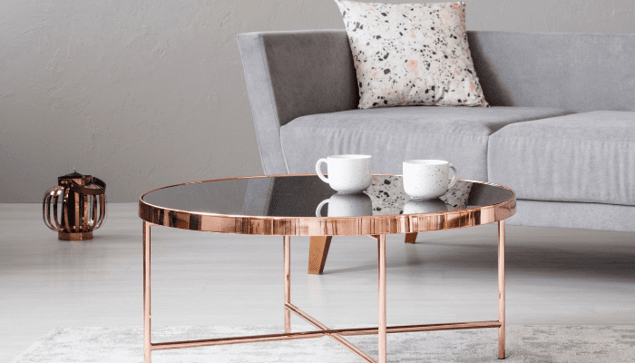 To avoid veering into tacky territory, stick to a refined, modern coffee table with basic geometric shapes. A simple design allows the material of the table — a light-reflecting mirror — to be the star of the show.
