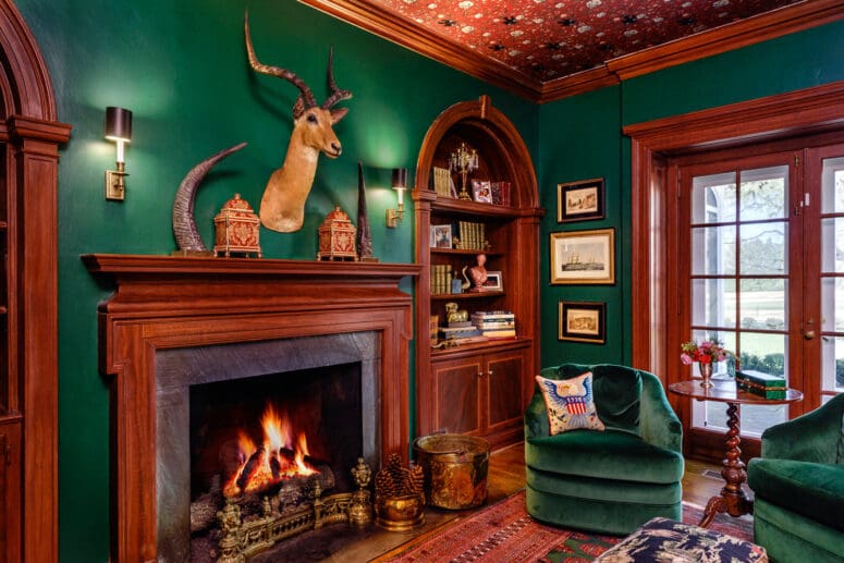 While the fireplace itself might appear traditional when taken alone, the bold, colorful details contrast and complement it, drawing attention to it while balancing its aesthetic. Of course, there are the deep green walls surrounding this fireplace — and did you catch the patterned wallpaper on the ceiling above?