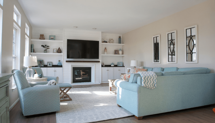 Andrea Hysmith of ASH Interiors and Design created this fireplace as a way to both update the space and solve her client’s problem. “This space was a traditional brick fireplace with no storage,” Hysmith explains. “Our client really wanted to make the space feel fresh as well as embrace her love of the beach.”