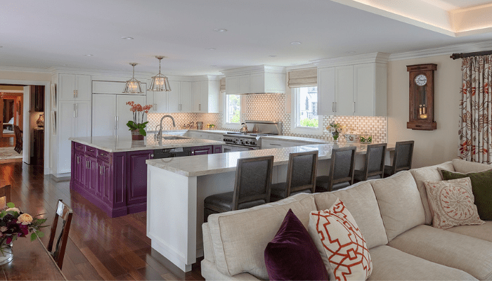 - Contrasting island and cabinet colors — for instance, the kitchen photographed above pairs white cabinetry with a modern eggplant island, similar to the shade Eggplant by Benjamin Moore