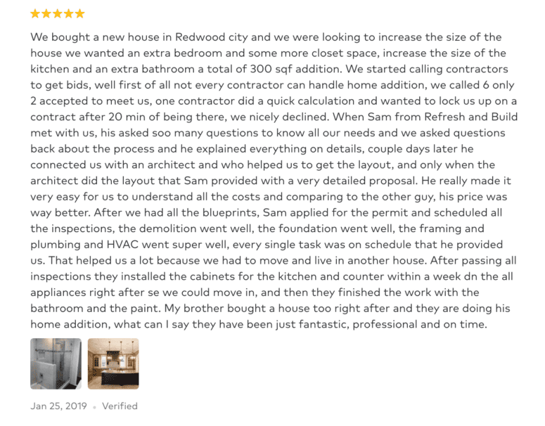 For example, this client review fits the bill for a qualified home remodeler: