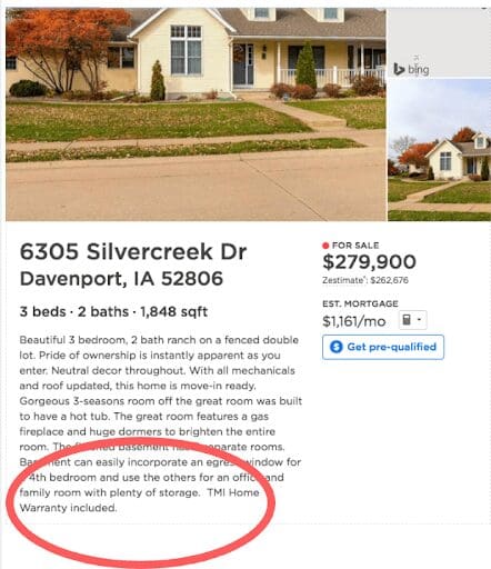 Go to any top real estate listing site and you’ll notice that some properties mention the home warranty, while others don’t. If you are offering buyers a home warranty, the listing description is one place where you can shout it from the rooftops. A simple mention of the inclusion of this insurance and the company that’s providing it will suffice.Source: (Zillow)