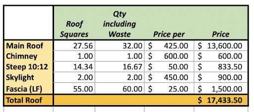 Feller also provided the below example of a quote she sent to a client for a 2,756-square-foot roof. In this example, she took 42.67 squares, which was the total square footage of the roof plus 15% waste, rounded up to the nearest third of a square.