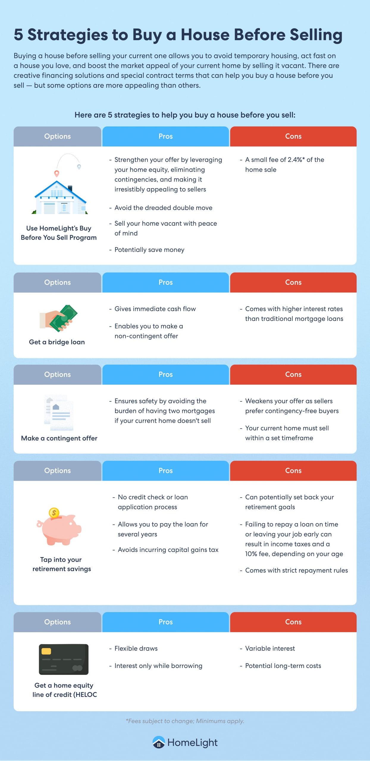 This strategy provides safety in that you won’t end up with two mortgages if your current home doesn’t sell. You also won’t pay fees for a short-term loan.