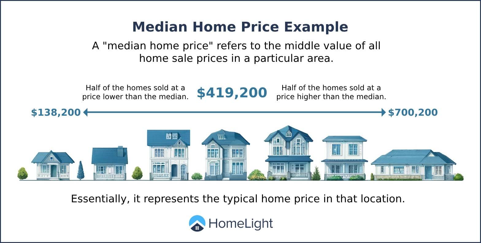 The median home price is the middle price of all homes sold in a specific area during a given time period. In other words, if you lined up all the sold homes from least expensive to most expensive, the median would be the one right in the middle.