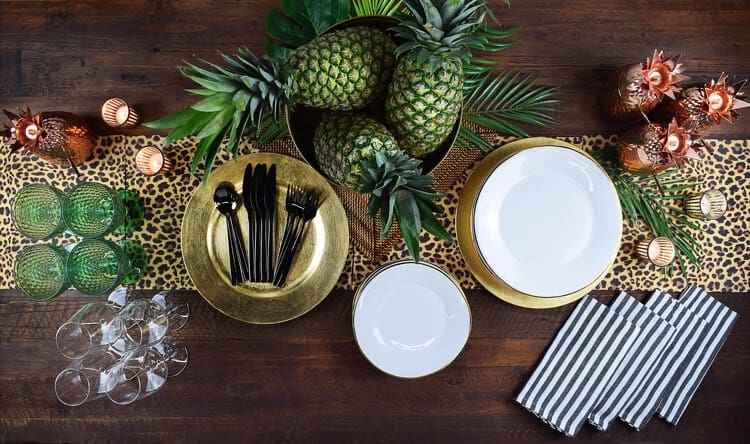 “We loved the layering of different fauna as well as the introduction of woven materials, mixed metals, and an unexpected pairing of animal prints with stripes,” Shortell shares, encouraging homeowners to experiment with their table settings and throw pillows.