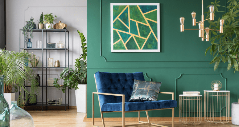 Maintain a modern look by styling your interior with 60% neutral colors and wood finishes, 30% green, and 10% vibrant colors from your inspo pic.