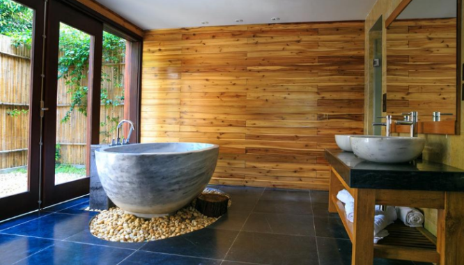 - Sliding divers: For the commitment-phobe, a retractable wall provides an option to close off the bath area on the days you desire more privacy. A privacy curtain made from organic linen or bronze chainmail offers a similar advantage.