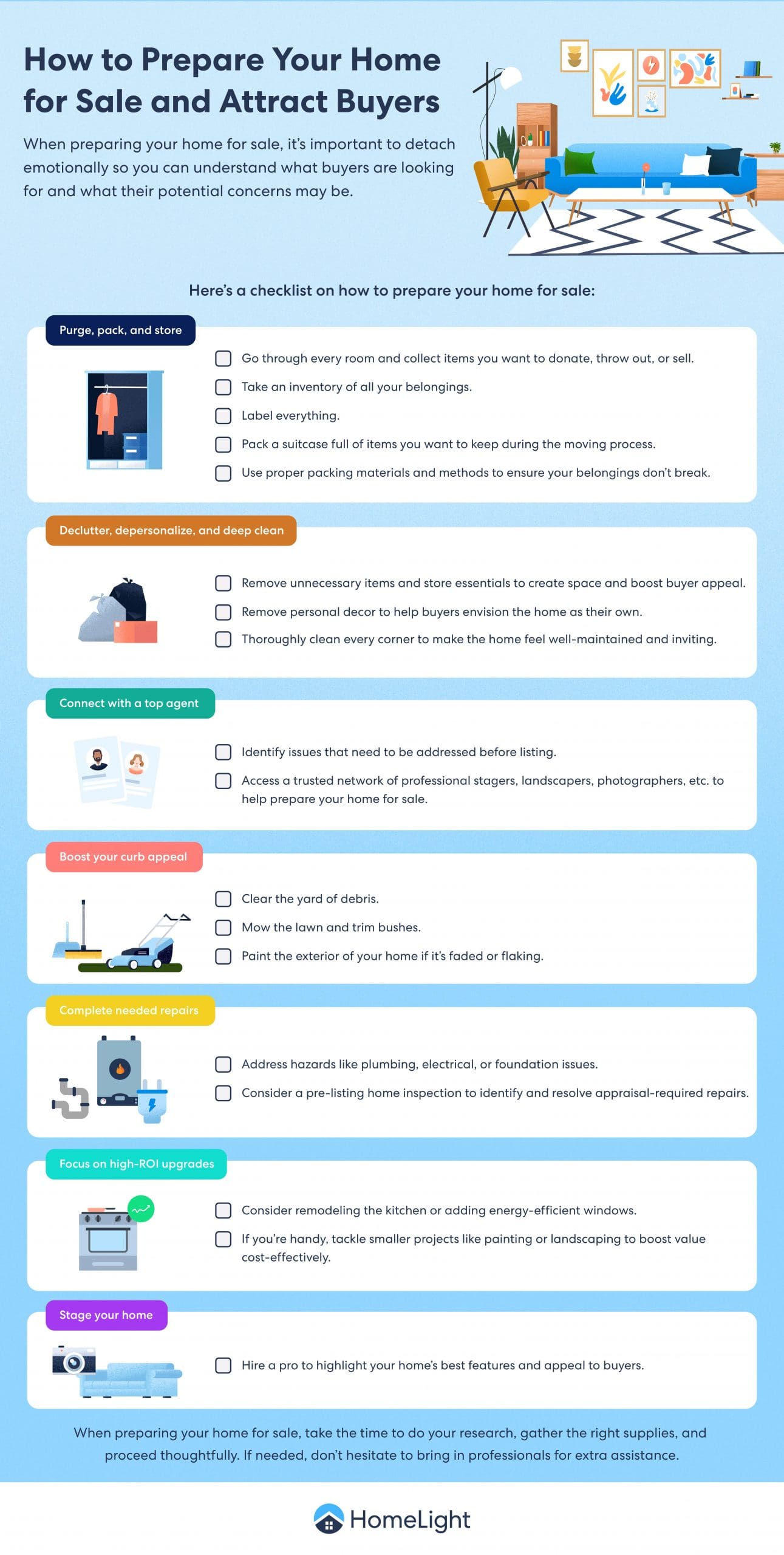 We consulted with experts and researched market conditions, buyer trends, and step-by-step guides to create this comprehensive checklist on how to prepare your home for sale.