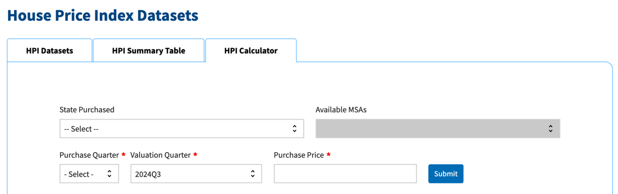 Another online method of researching your home’s value is to use the Federal Housing Finance Agency’s (FHFA) Price Index Calculator. This free tool is publicly available and easy to use by punching in the following data: